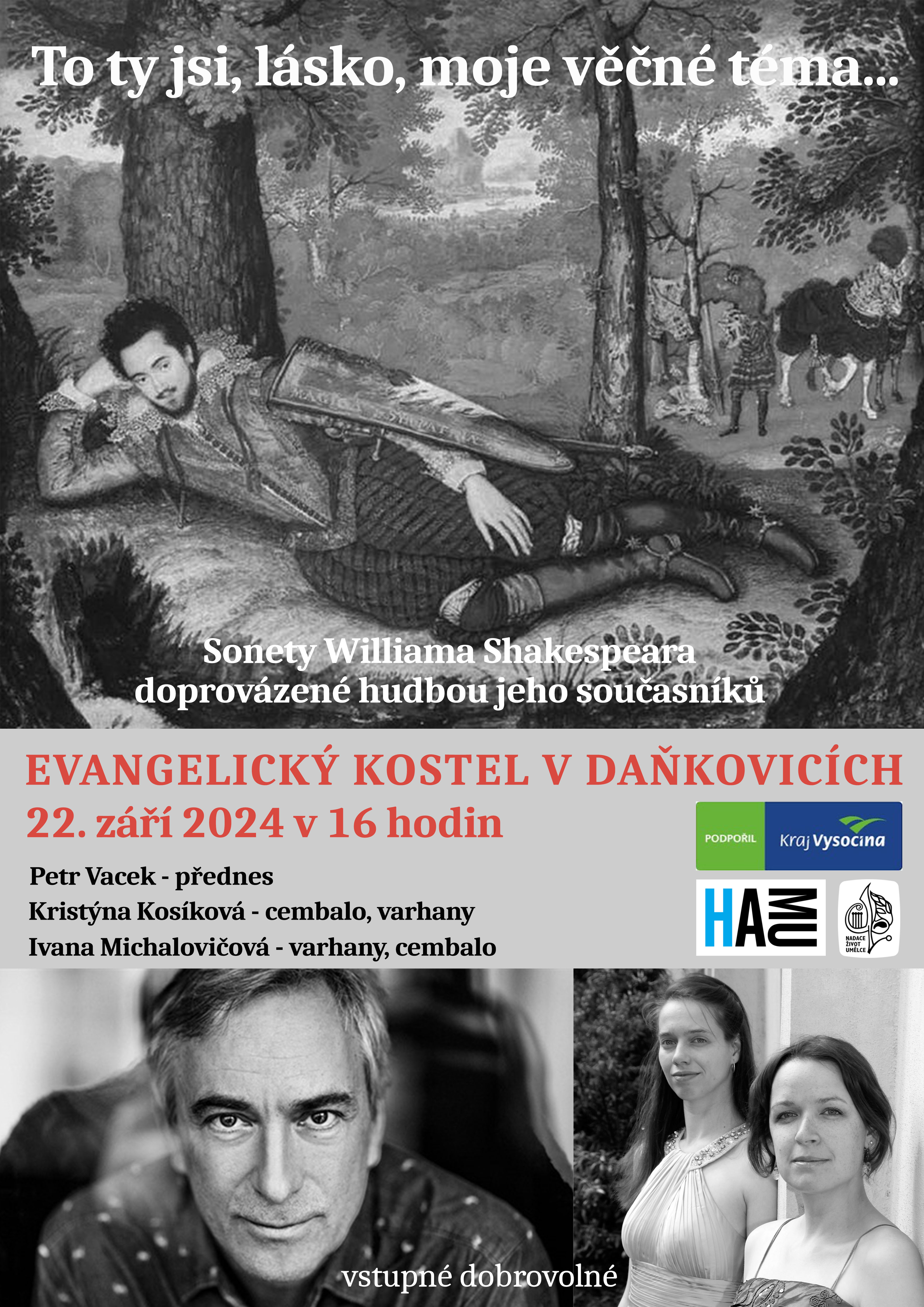 Vystoupí známý herec a moderátor Petr Vacek (přednes), Kristýna Kosíková a Ivana Michalovičová (varhany, cembalo).